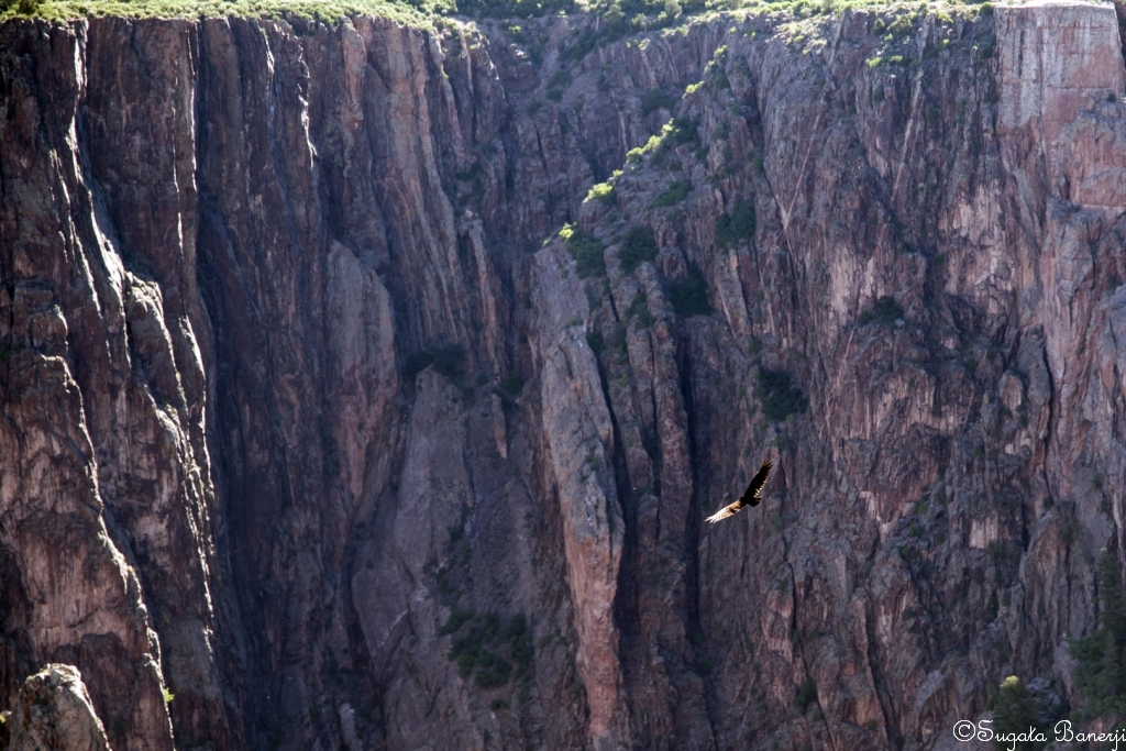 There are walls of rock hundreds of feet tall in the canyon where the river decided to fork millions of years ago, and rejoin downstream. The turbulent water flowed white and the constant murmuring sound that reached our ears from that abyss was a reminder how deafeningly loud that sound must be at the bottom. The Gunnison River drops an average of 34 feet per mile in the entire canyon. By comparison, the Colorado River drops an average of 7.5 feet per mile through the Grand Canyon.
